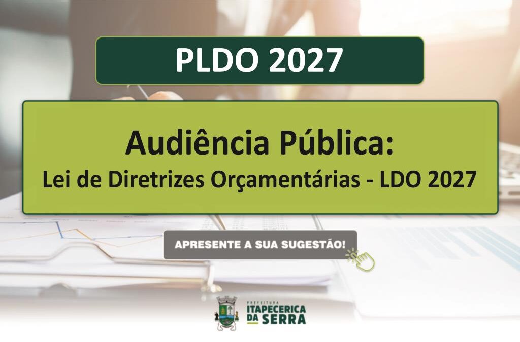 A Prefeitura de Itapecerica da Serra informa que disponibilizará no período de 5/02 a 27/02/2026, no portal oficial Itapecerica.sp.gov.br e em suas mídias sociais, um formulário para que os munícipes registrem os problemas, necessidades e deficiências do município e apresentem as prioridades e sugestões que julgarem mais relevantes para o desenvolvimento do nosso Município. Para acesso basta CLICAR AQUI: “Audiência Pública: Lei de Diretrizes Orçamentárias – LDO 2027”.